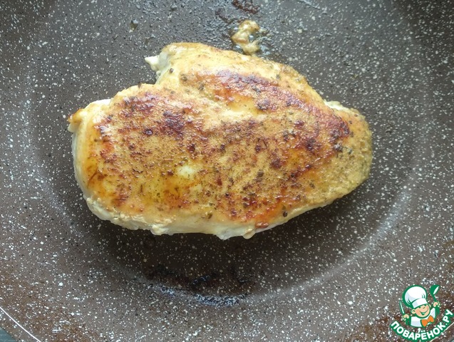 Куриное филе обмазать специями и обжаривать с каждой стороны на оливковом или растительном масле (2 ст. л.) до румяности. Затем переключить плиту на самый минимум и оставить филе под закрытой крышкой на 10-15 мин.