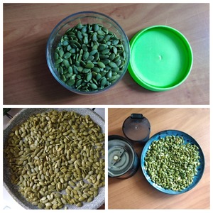 Берём очищенные тыквенные семечки. Такие сейчас купить можно в любом магазине. Так как семечки в себя впитывают влагу, до приготовления их нужно подсушить на сухой сковороде пару минут. Даём остыть семечкам и разбиваем их до порошка. Скажу сразу, что лучше использовать кофемолку, чем блендер. Разбиваем в кофемолке частями.