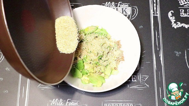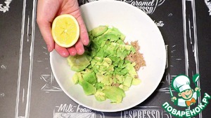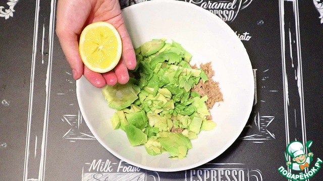 Поливаем лимонным соком (~2 ч. л.), чтобы авокадо не потемнел.