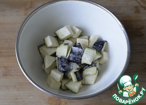 Баклажан моем, режем кубиками, засыпаем солью, чтобы вышла горечь, отставляем на 20 минут.