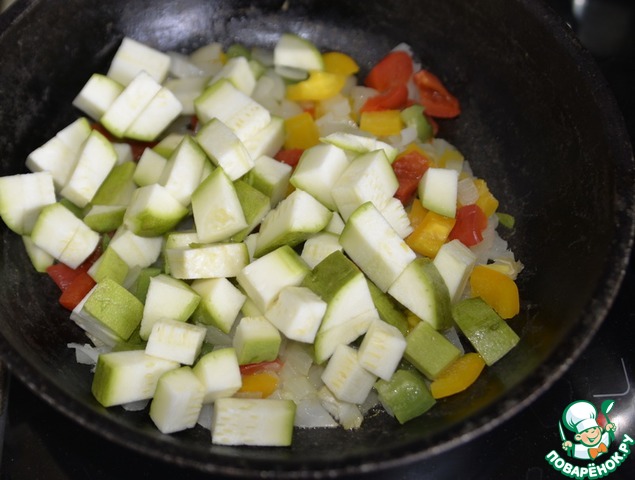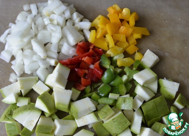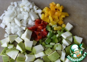 Овощи моем, лук и перцы чистим. Лук режем мелкими кубиками. Перцы и цуккини покрупнее.