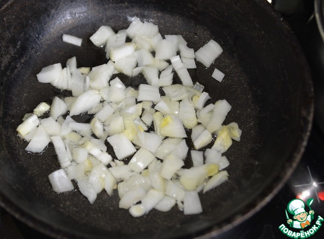 Для приготовления берём глубокую сковороду или сотейник, или казан. Нагреваем, наливаем масло, на среднем огне обжариваем лук до прозрачности около 5 минут.