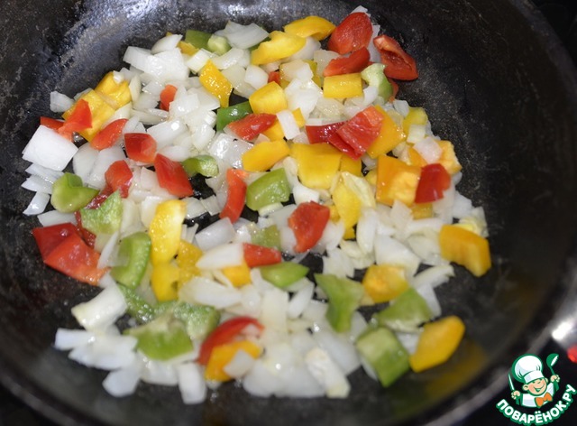 Кладём перцы и обжариваем их ещё 5 минут.