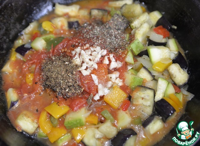 Кладём порезанные кубиками помидоры, если нет, как у меня, то томаты в собственном соку. Добавляем по вкусу соль, но помним, что баклажаны солёные. Кладём измельчённый чеснок, смесь перцев, орегано, зиру, сахар. У меня эти приправы в составе смеси для тушения овощей.