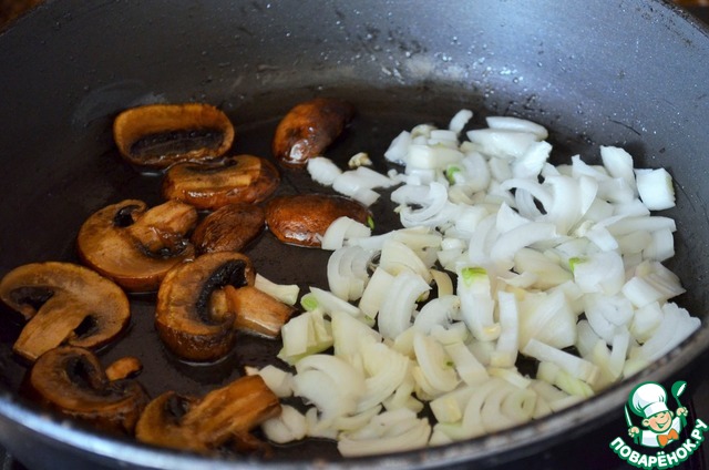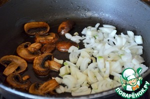 В сковороду выложить заранее отваренные грибы + 1 ст. л. растительного масла, обжарить 5-7 минут с луком.