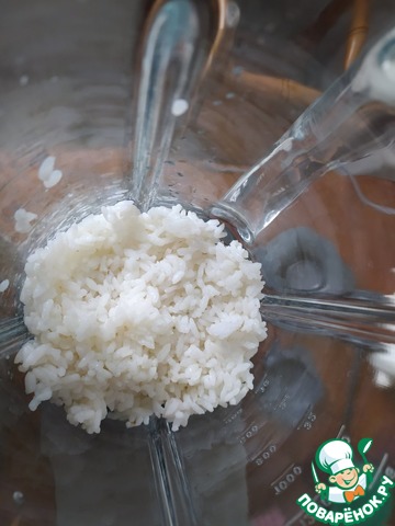 Рис промыть, сварить до готовности, остудить. Пересыпать в чашу блендера.