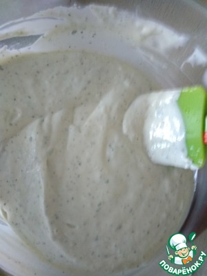 Творожный сыр пробить с оставшимся рассолом, желатином и зеленью.