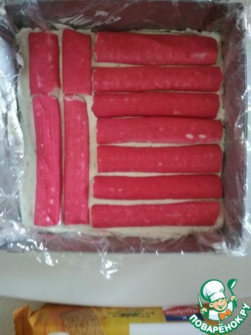 Сверху разместить крабовые палочки. -
