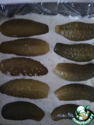 Огурцы разрезать вдоль на 2 части и уложить в форму. -