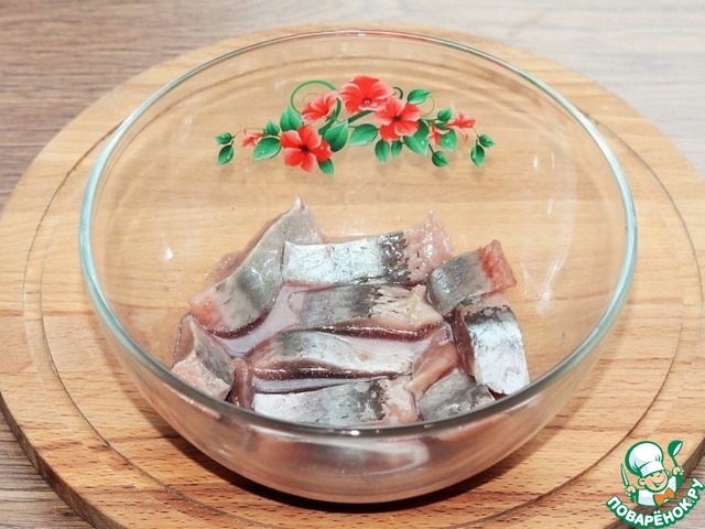 2. Селедку очистить, удалить все кости и кожу. Филе нарезать кусочками произвольной формы и выложить в миску.