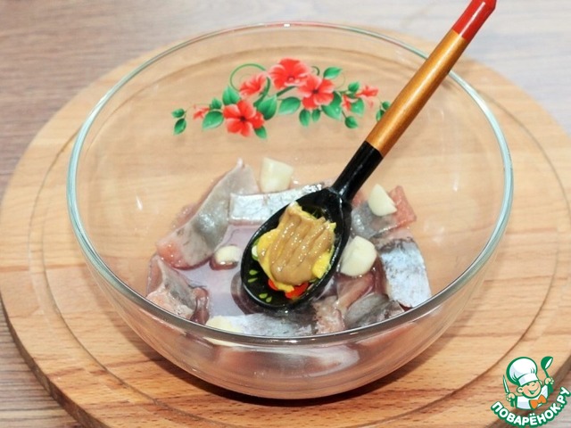 3. К селедке добавить столовую горчицу и чеснок. Чеснок нарезать крупно, все равно перемалывать.