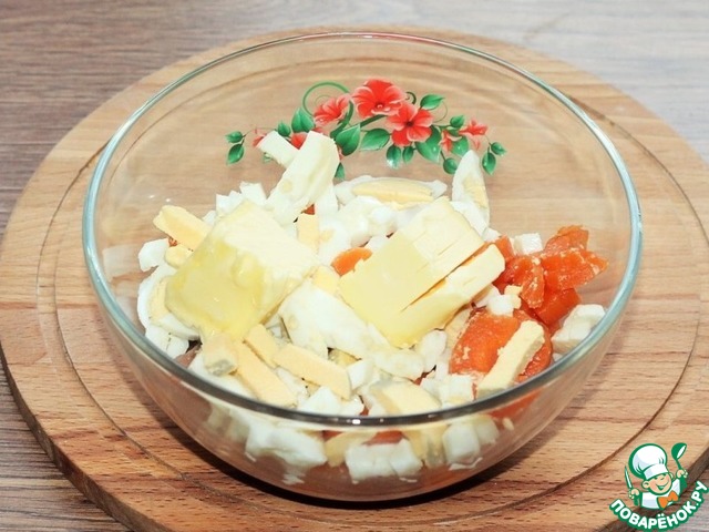 Яйца и морковь сварить до готовности, остудить, почистить, нарезать произвольно.