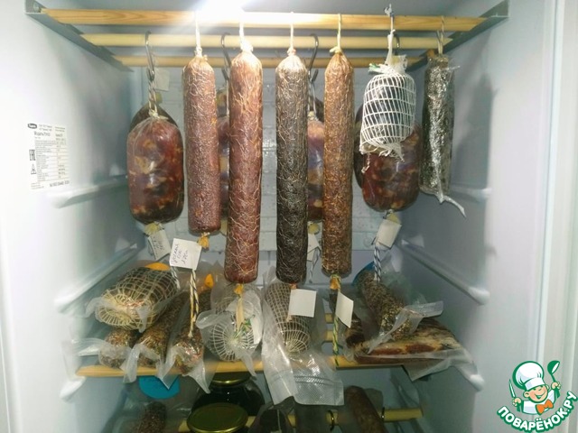 Далее нашей колбаске надо повисеть для осадки. Подвешиваем в холодильнике (или на балконе в холодное время) часов на 10, а потом при комнатной температуре на 3-4 часа. Это уже для отепления. Температура внутри батона должна достигнуть 16-20 градусов.