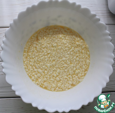 Отдельно смешайте яйца, оставшийся сахар, ванилин и соль. Затем добавьте растительное масло, теплые сливки и размягченное сливочное масло, перемешайте венчиком.