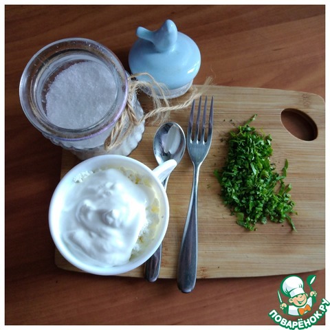 Делаем пасту-намазку. Говорят, что для пользы организма кисломолочные продукты нужно брать с любым процентом жирности. Обезжиренные продукты нам не подойдут. Я взяла творог 5 %, чтобы он был помягче, я добавлю к нему немного сметаны. Соединю и отожму из дольки лимона сок по вкусу. Попробую и чуть присолю морской солью. Мелко порублю зелень: петрушку и укроп, добавлю к массе, опять соединю.