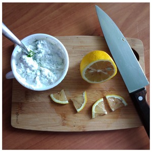 Паста-намазка готова. Для украшения бутербродов я ещё тонко порежу дольки лимона на четвертушки.