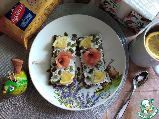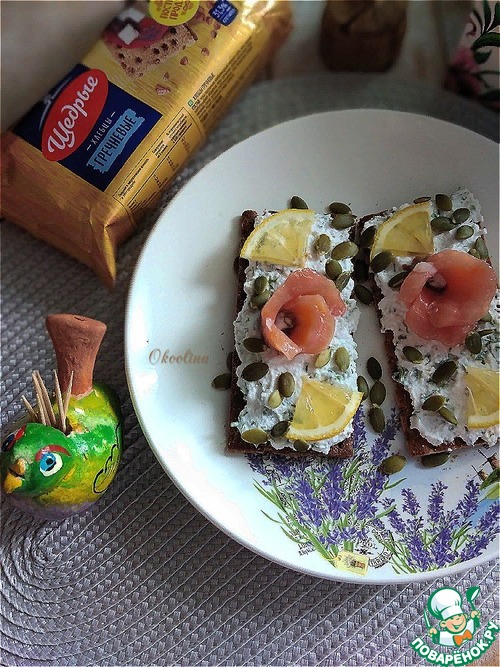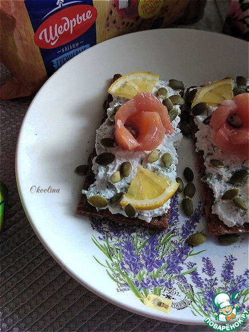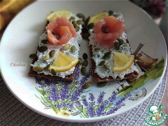 Намазываем каждый хлебец пастой-намазкой. Её хватит на 6 хлебцов. Красиво выкладываем рыбу м украшаем лимоном и тыквенными семечками.