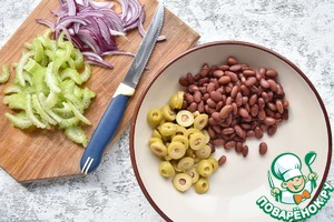 Стебли сельдерея зачистить от грубых волокон и нарезать тонкими ломтиками. Красный лук очистить от шелухи и нашинковать тонким перышками. В миске соединить отварную красную фасоль и нарезанные колечками оливки (маслины).