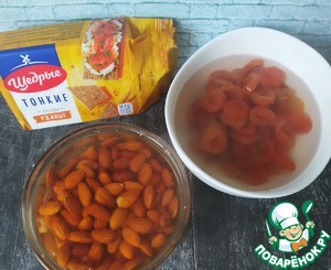 Курагу порезать на небольшие небольшие кусочки. Оставьте несколько целых кусочков кураги для украшения торта.