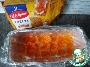 Приступим к сборке. Форму застелить пленкой для выпечки. На дно уложить кусочки целой кураги.
