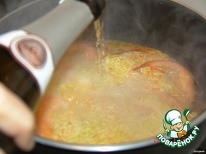 Опять плотно накрываем крышкой и, когда вода упарится приблизительно наполовину, добавляем немного шампанского или белого вина.