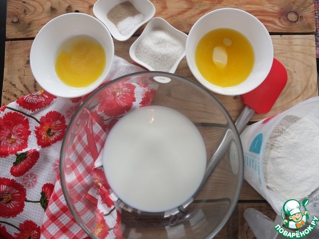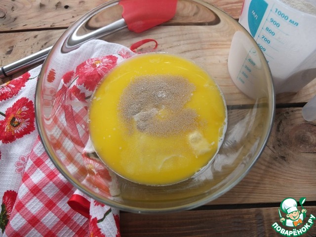 В молоко добавляем масло, желток, 2 ст. ложки сахара, ванильный сахар, соль и дрожжи. Перемешиваем.