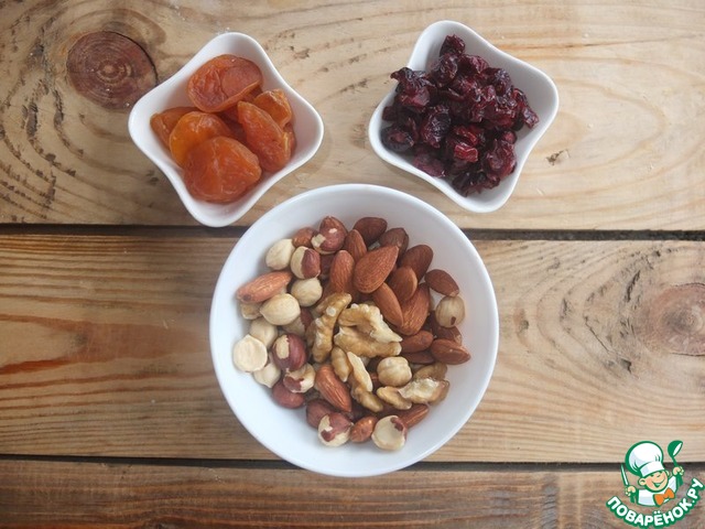 Я взяла орехи трех видов (фундук, миндаль и грецкие), курагу и вяленую клюкву.