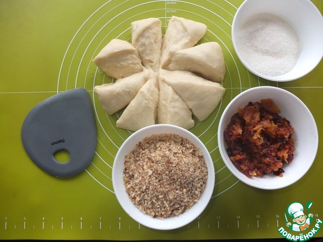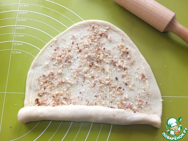 Каждую из частей раскатываем как можно тоньше, обильно смазываем размягченным сливочным маслом (комнатной температуры), посыпаем сахаром и орехами.