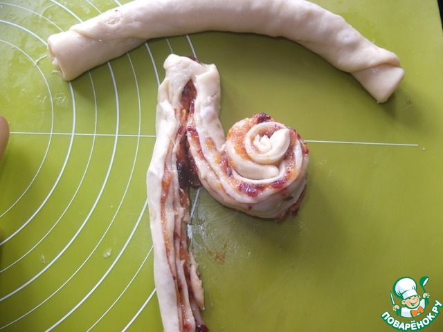 Сворачиваем тесто в рулет, растягивая тесто по бокам, чтобы "колбаска вышла длинее".