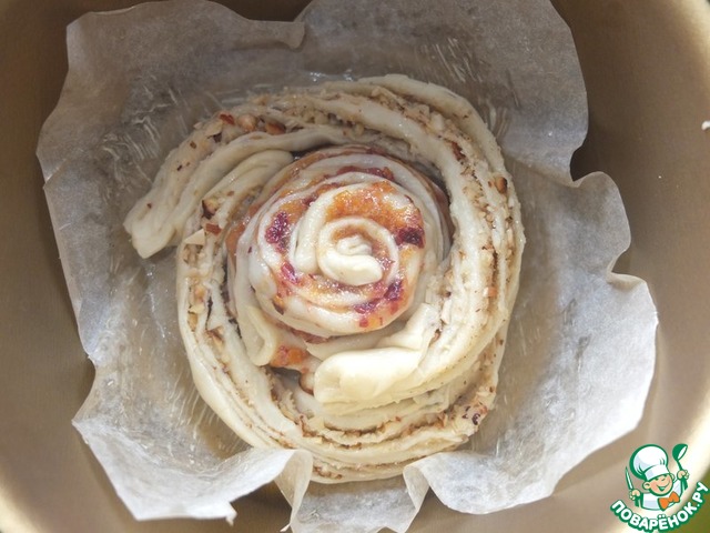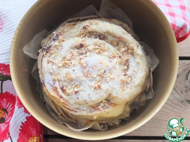 Верх краффина смазываем сливочным маслом, посыпаем сахаром и измельченными орехами.