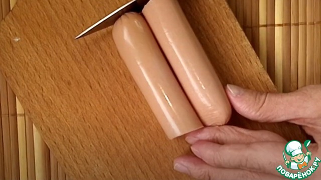 Затем данные полоски наматываем на подготовленные сосиски.
