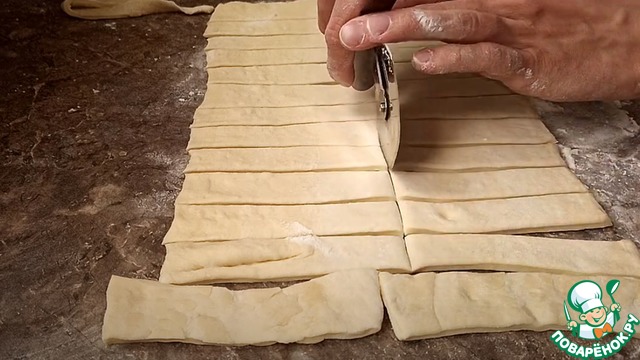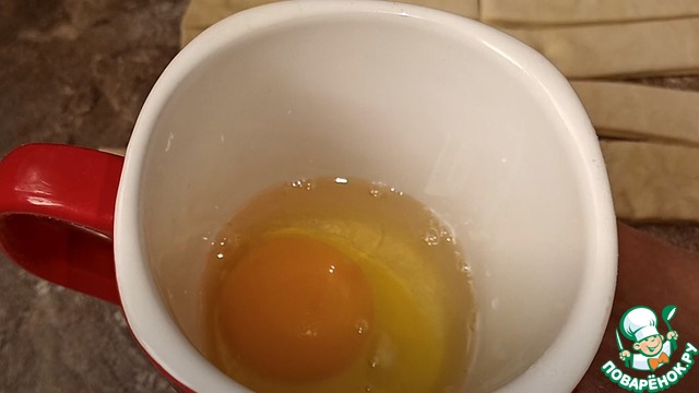 Эти полоски нужно смазать куриным взбитым яйцом.