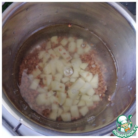 Наливаем воду в кастрюлю и ставим на огонь. Отправляем тула гречневую крупу и порезанный мелким кубиком картофель. Когда вода закипит, посолим суп по вкусу и варим примерно 15 минут до готовности гречи и картофеля на минимальном огне под крышкой.