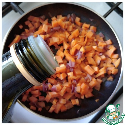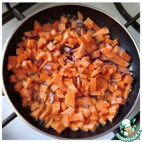 Пока варится греча и картошка, берём подходящую небольшую сковородочку или сотейник, выкладываем мелко порезанные кубиком овощи: лук и морковь. Наливаем 3-4 ст л жидкости из кастрюли и припускаем овощи до мягкости минут 5. Попробуйте морковь, она должна быть почти готова.