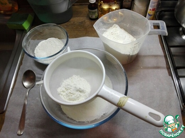 Первым делом - подготавливаю муку. Просеиваю через сито 100 граммов для опары и 700 граммов для теста и присыпки для обминки.