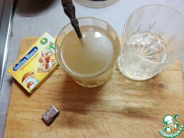 В 250 мл. тёплой воды растворяю половину кубика грибного бульона - тоже только для аромата. Важно помнить, что бульон получится достаточно солёным, так что просолку теста надо регулировать самому, после первой расстойки!