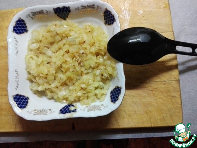 На хорошо прогретой, без масла (!!!) сковородке обжариваю лук, удаляя, таким образом, лишнюю влагу.