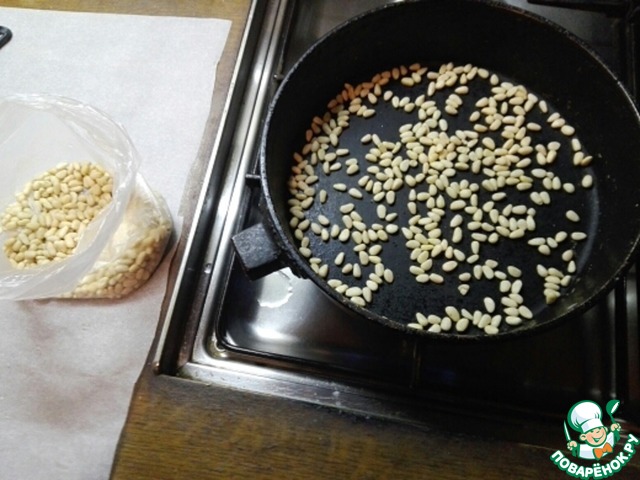 На сухой же сковородке обжариваю кедровые орешки. (Если вы взяли не обжаренные семечки подсолнуха, а может быть - тыквенные, обжаривайте вместе).