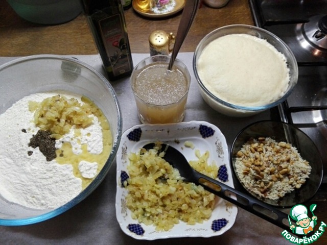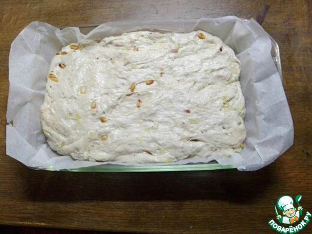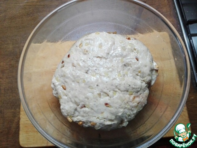 Смешиваю основную массу муки (650 гр гр, 50 гр. оставляю для обминки), бульон с мёдом, поднявшуюся опару, оливковое масло, специи, лук с чесноком, орехи и семечки, соль. -