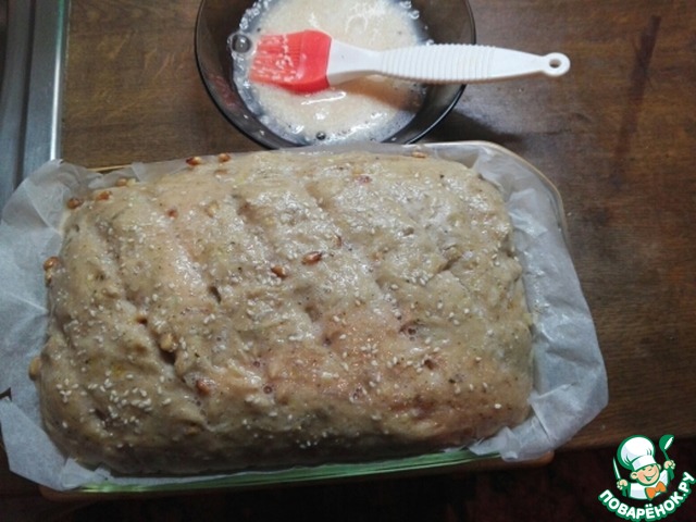Через 20 минут достаю форму с тестом, быстро смазываю льезоном, посыпаю оставшимся кунжутом и крупной солью и - снова - в духовку, минут на 10 - 15.