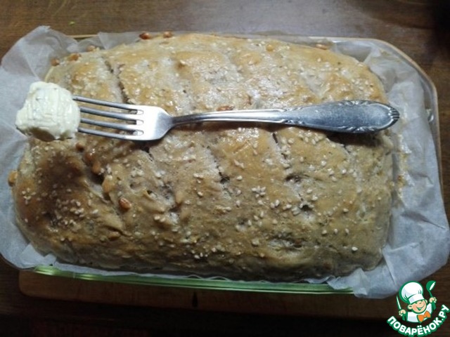 Достаю испечённый хлеб из духовки, проверяю зубочисткой на готовность, сверху смазываю сливочным маслом для цвета и блеска.