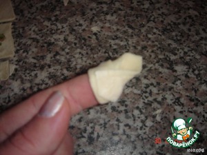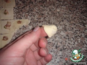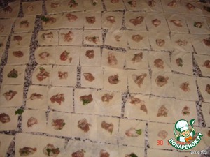 Тонко раскатать и нарезать квадратиками. На середину каждого положить кусочек фарша.
