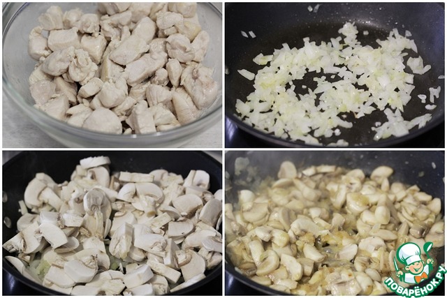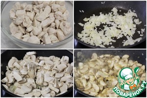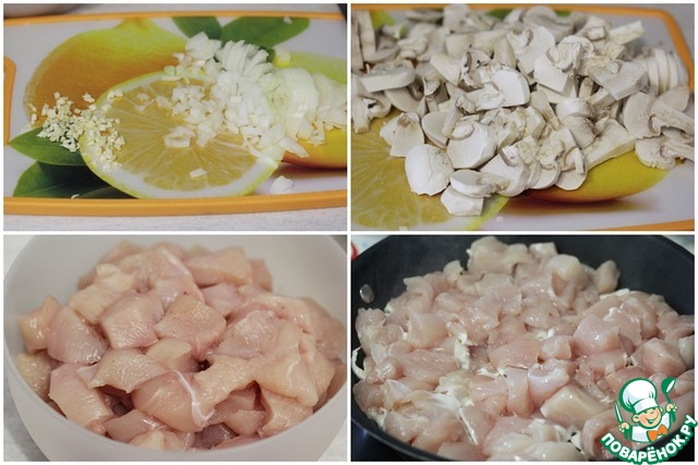 Шампиньоны нарезать на ломтики, куриное филе – на среднего размера кусочки.