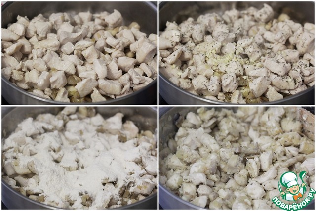 Затем посыпать курицу мукой и готовить, помешивая, еще 1 минуту. -