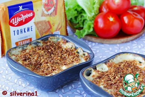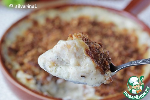 Нежные кусочки куриного филе и ломтики грибов в густом сливочном соусе, и все это под хрустящей ароматной корочкой... Очень вкусное блюдо, рекомендую.