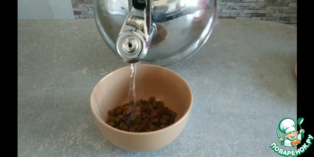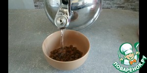 1. Заливаем изюм кипятком и оставляем на 10-15 мин.