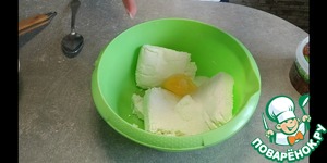 2. В тарелку выкладываем творог, добавляем ванилин, сахар