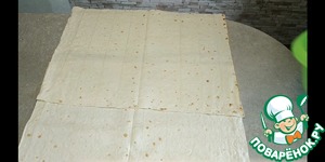 Выкладываем листы лаваша внахлёст. Сверху распределяем начинку