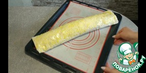 Сворачиваем рулет. Смазываем желтком и посыпаем кунжутом