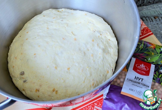 В опару добавить нутовое пюре и просеянную муку, смешать.